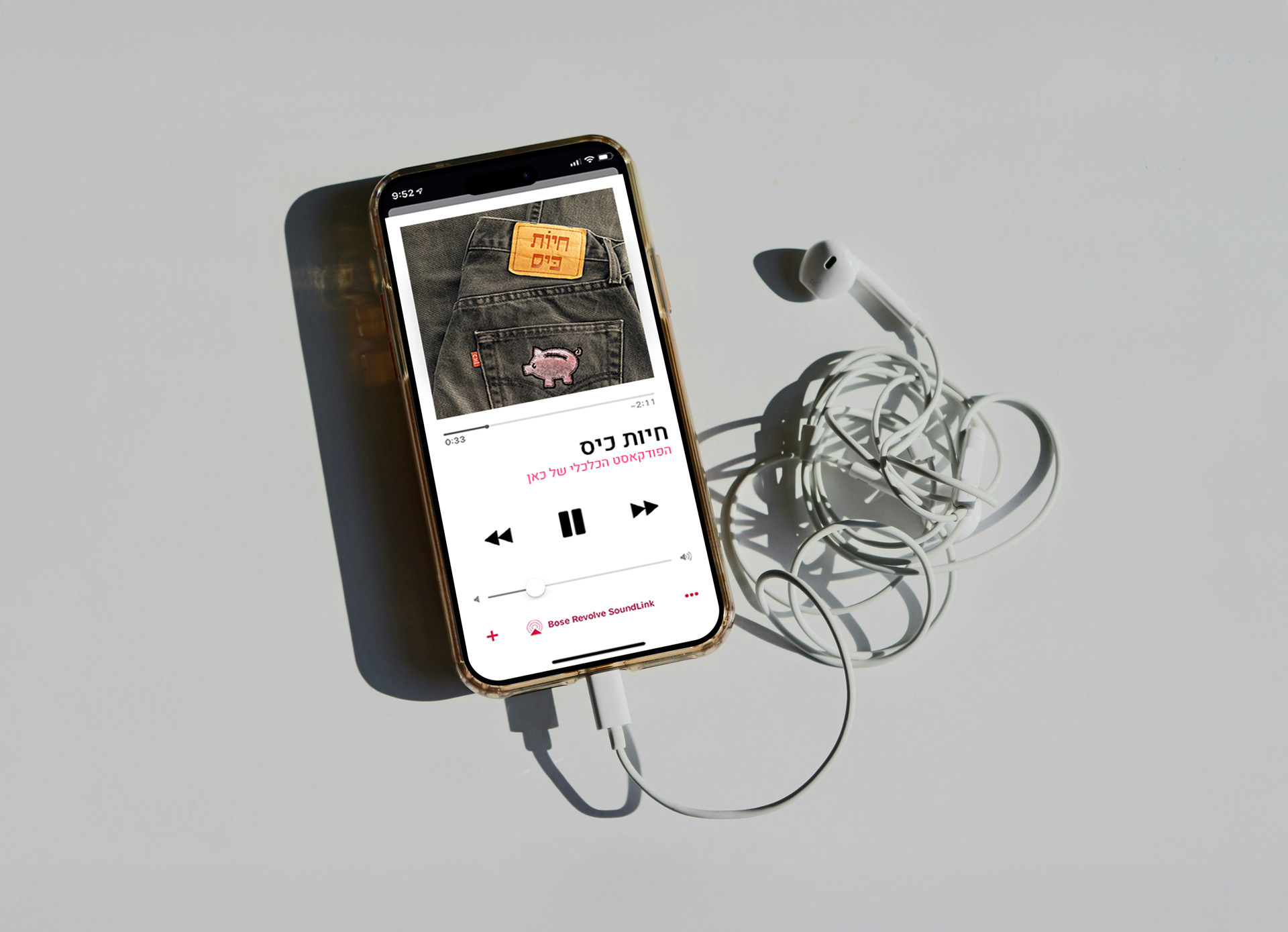 Using a jeans pocket connects directly to the podcast’s name, “Hayot Kis” (“Pocket Creatures”), symbolizing personal finance and the idea of money management.