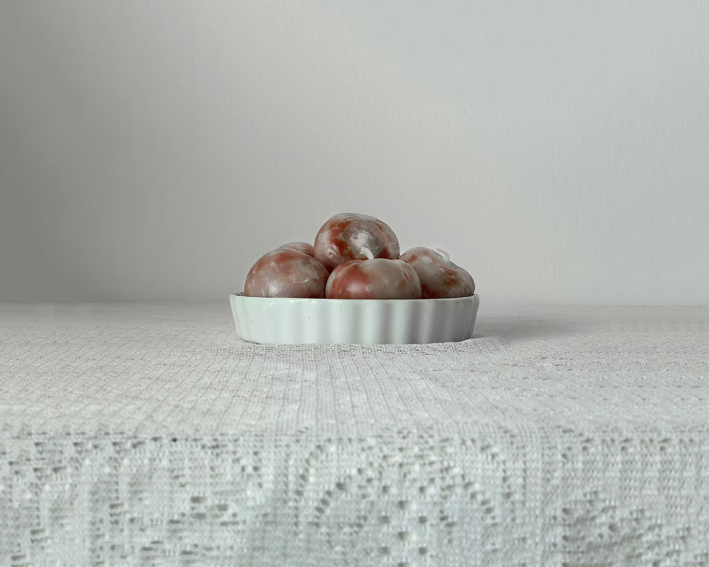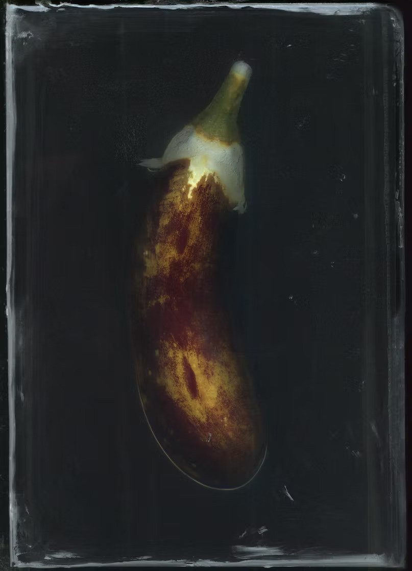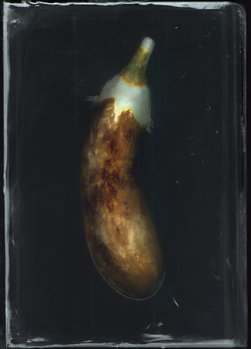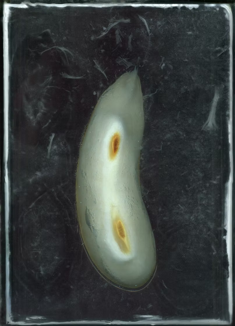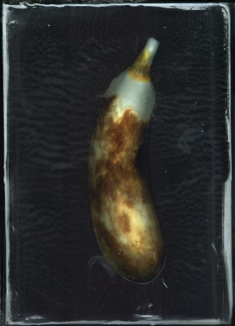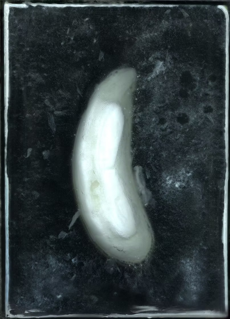 This question led me to create a domestic lab where I submerged various fruits and vegetables in jars of bleach—a familiar household substance associated with whitening. I didn’t want to digitally desaturate the objects but rather physically strip their color beforehand to explore the raw power of composition alone. I built an aquarium resting on a scanner and documented the stages of bleaching over time.