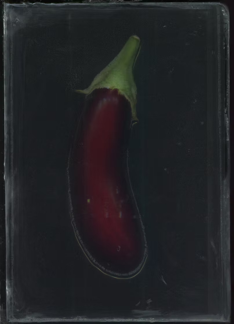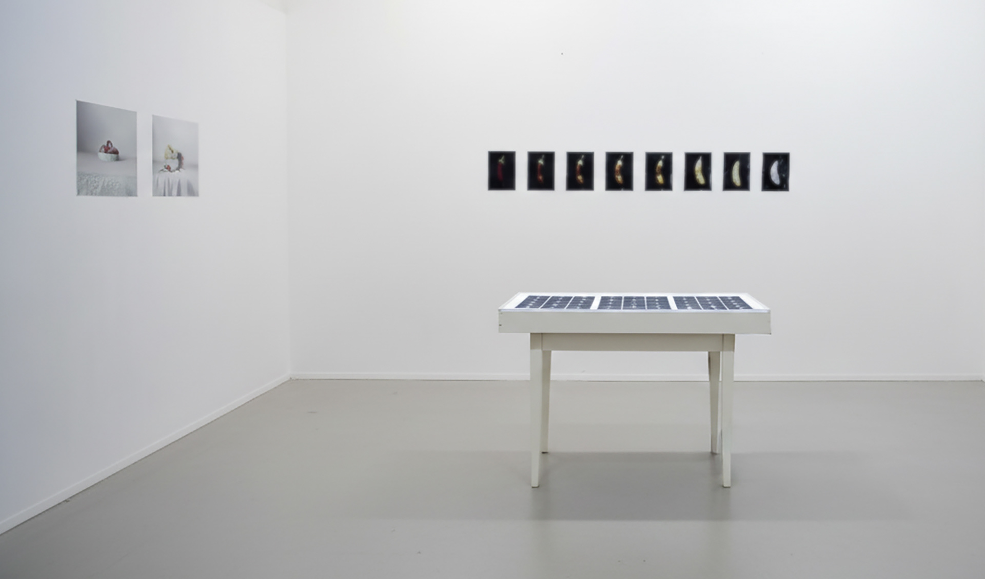 Many of the works in the series are scans that document the bleaching process, reminiscent of X-ray photography. Aside from two "color still life" pieces and one image that captures the lab itself, the main installation is a light-table made from a dining table, displaying all the scanned produce.