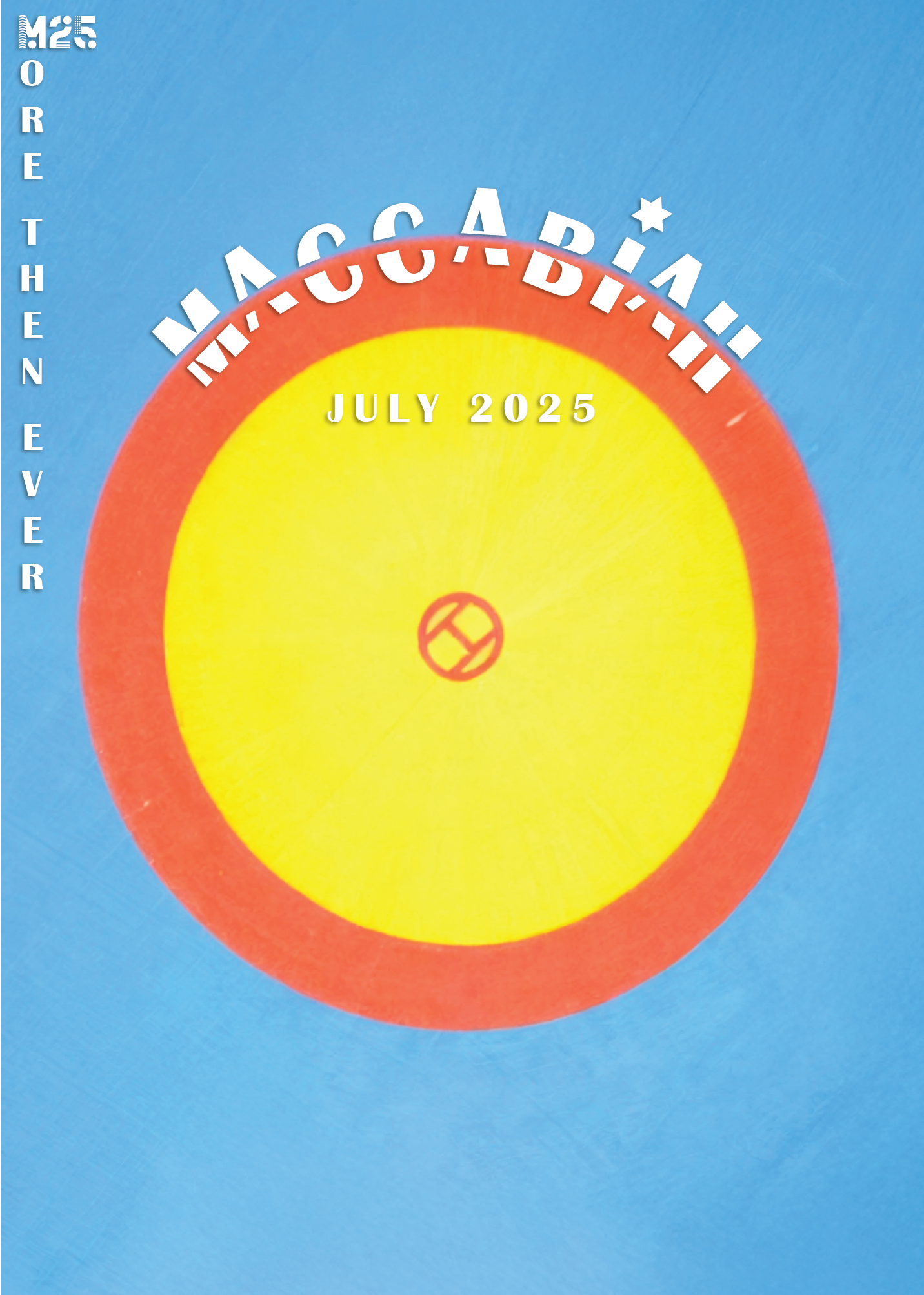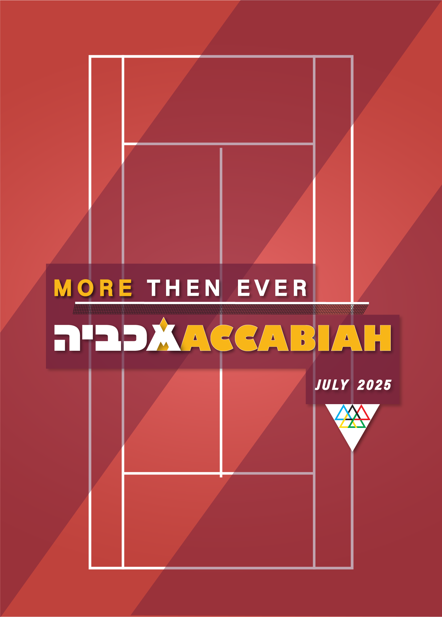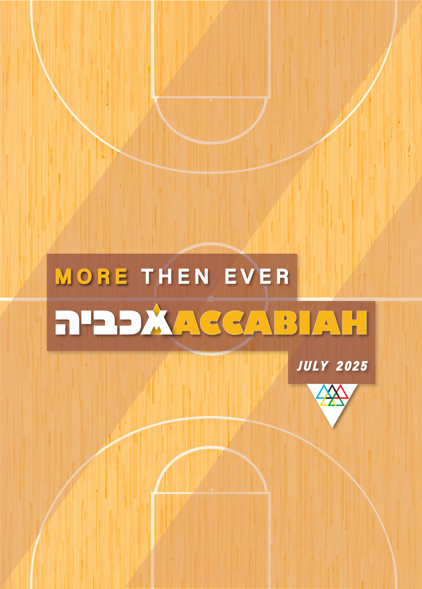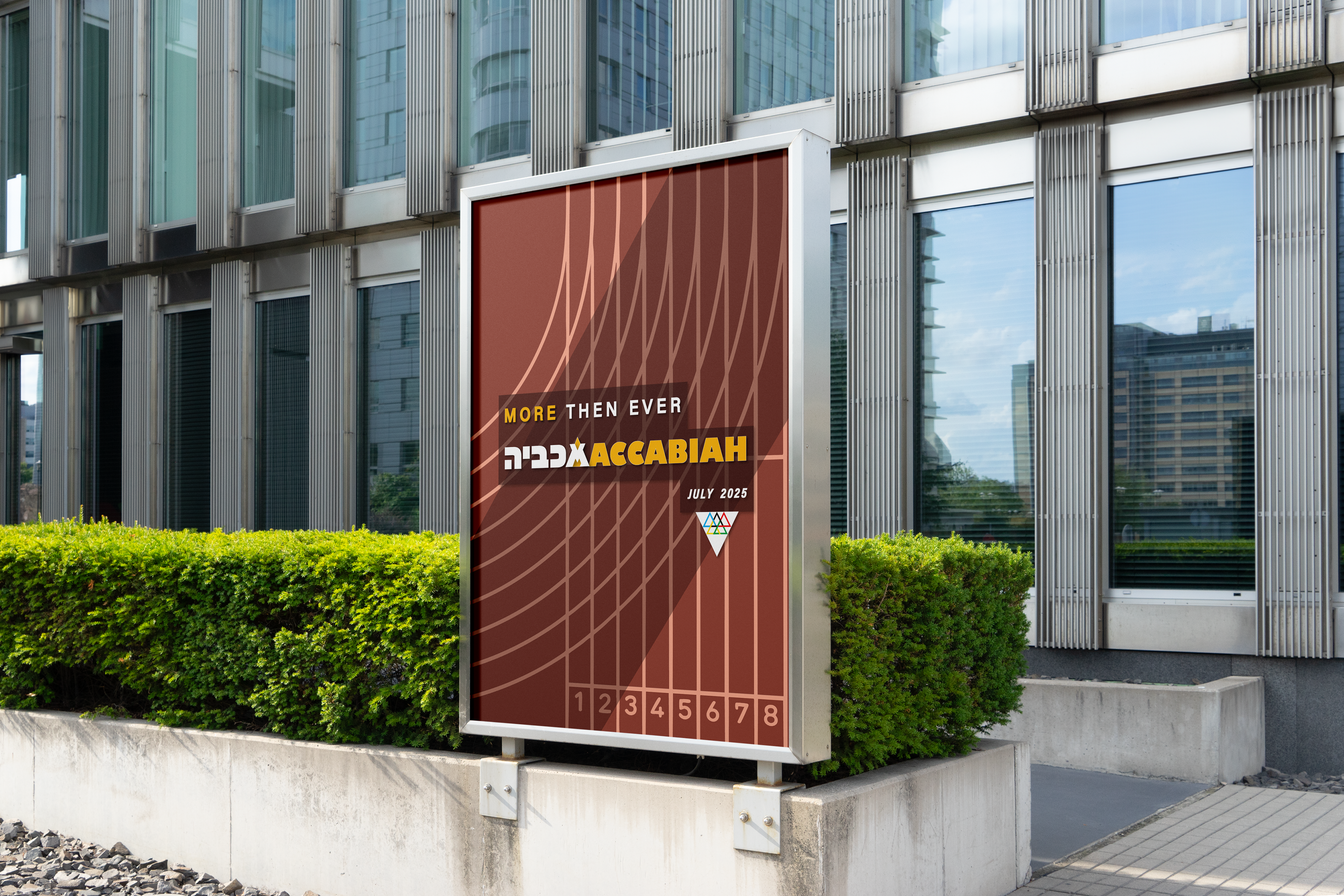 The first symbol deconstructs the Star of David into its six component triangles, rearranged into a new variation inspired by the Olympic rings - serving as a metaphor for the Maccabiah, often referred to as the Jewish Olympics. The second symbol combines the Hebrew letter “מ” (Mem) with the Latin “M”, forming a unified mark that echoes the shape of the Olympic torch.