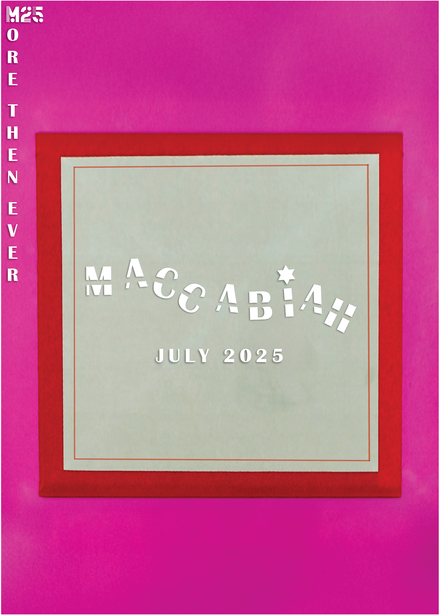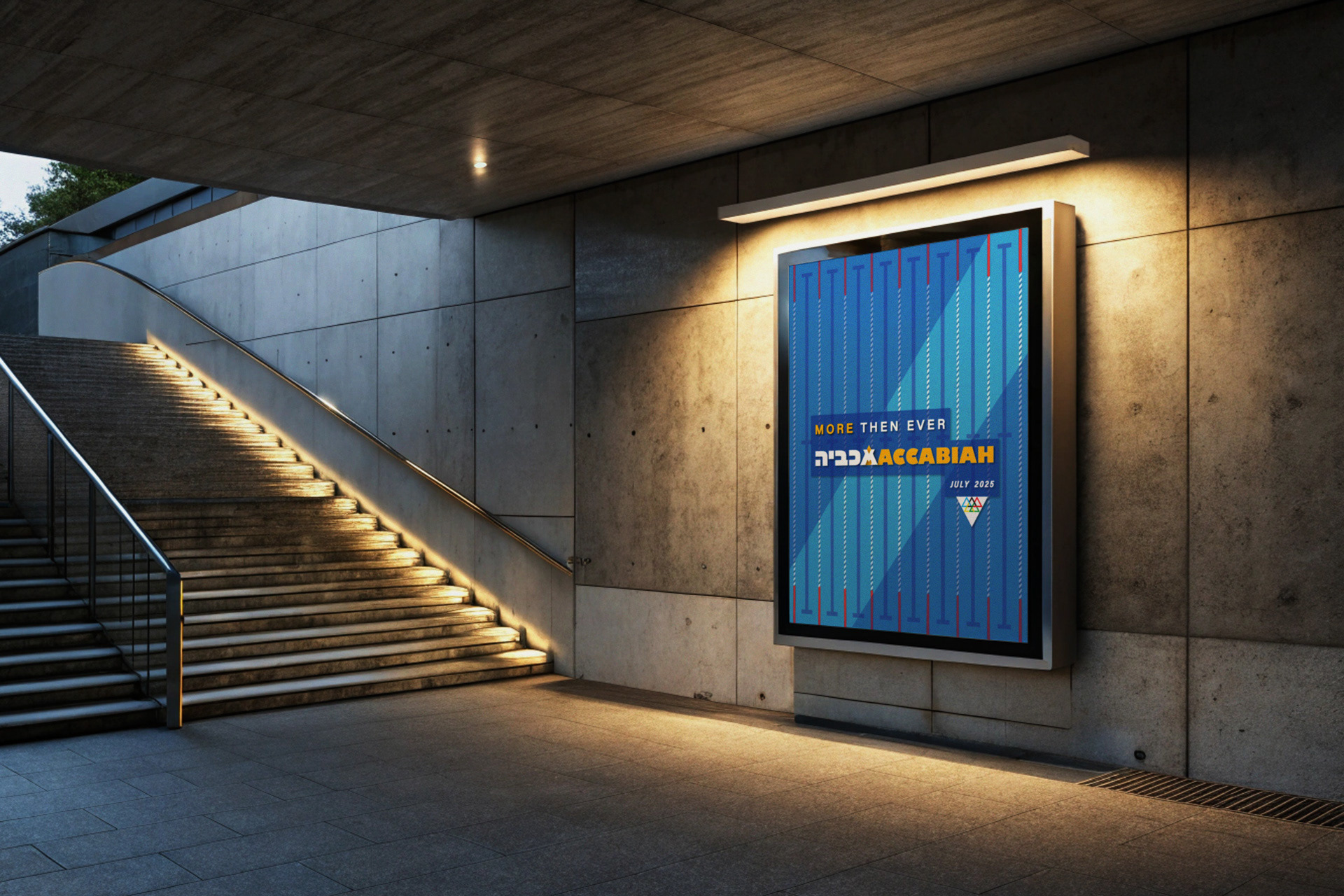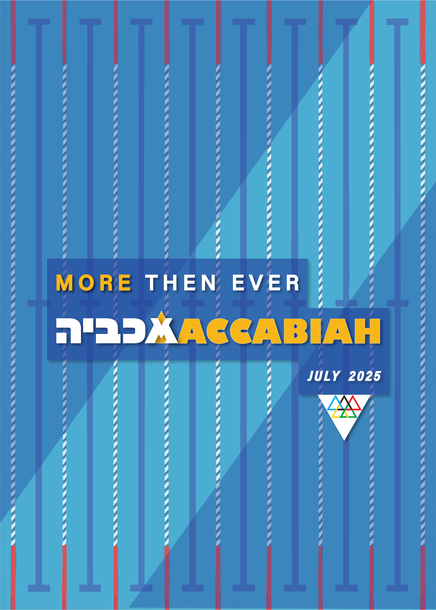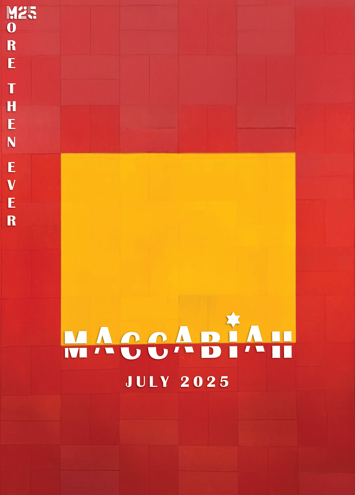 The first symbol deconstructs the Star of David into its six component triangles, rearranged into a new variation inspired by the Olympic rings - serving as a metaphor for the Maccabiah, often referred to as the Jewish Olympics. The second symbol combines the Hebrew letter “מ” (Mem) with the Latin “M”, forming a unified mark that echoes the shape of the Olympic torch.